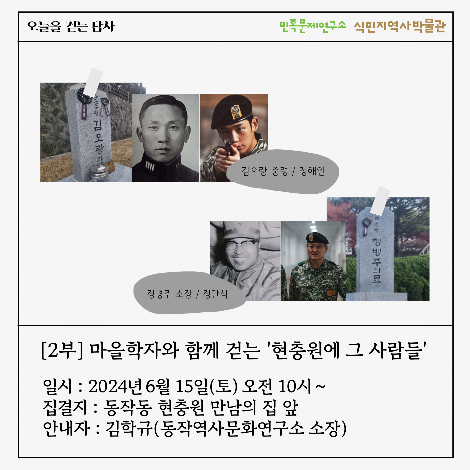 【2부】 마을학자와 함께 걷는 '현충원에 그 사람들' ◾️ 일시 : 2024년 6월 15일(토) 오전 10시 ~ ◾️ 집결 장소 : 동작동 현충원 만남의 집 앞 ◾️ 안내자 : 김학규 (동작역사문화연구소 소장)
