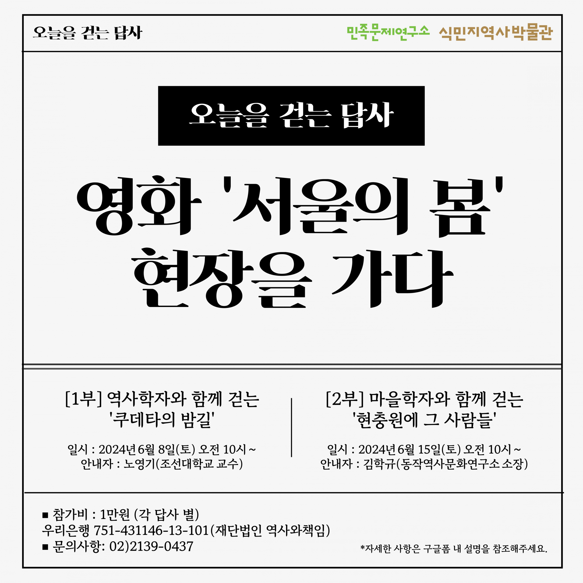 지난 해 연말 개봉하여 천만 관객을 동원한 영화 ‘서울의 봄’ 당시의 현장을 답사하고 또 그때 그 사람들의 현재를 확인하는 답사를 통해 불행한 과거, 기억에서 지우고 싶은 당시를 정확히 기억하고 기록합니다. 아울러 아쉬운 결말로 귀결된 ‘반역사적 국가범죄에는 공소시효는 없다’라는 희망을 나누는 시간을 통해 과거를 반복하지 않기 위한 성찰의 시간을 갖고자 합니다. 시민 여러분들의 많은 관심과 참여를 부탁 드립니다.