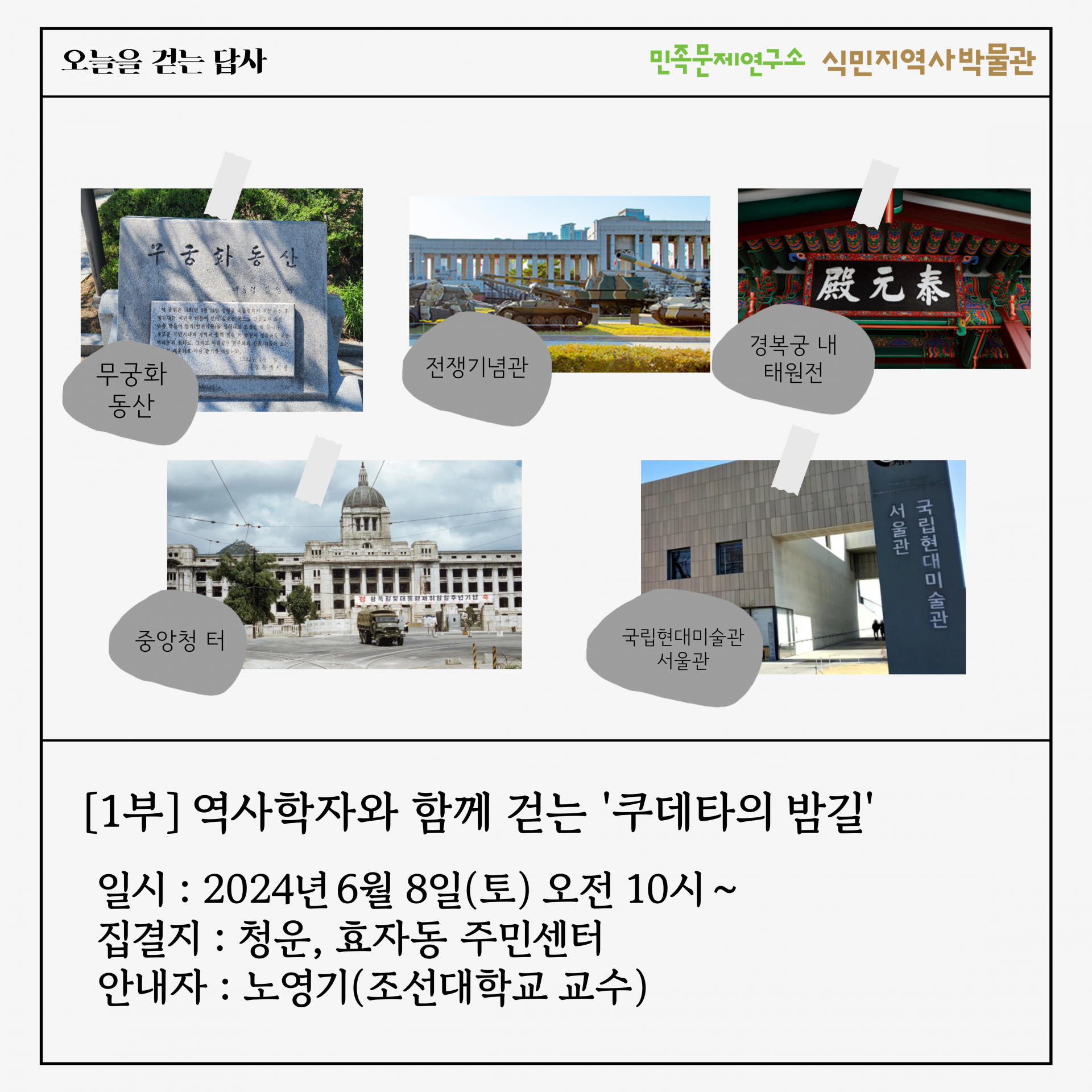 【1부】 역사학자와 함께 걷는 '쿠데타의 밤길' ◾️ 일시 : 2024년 6월 8일(토) 오전 10시 ~ ◾️ 집결 장소 : 청운, 효자동 주민센터 앞 ◾️ 안내자 : 노영기 (조선대학교 교수)
