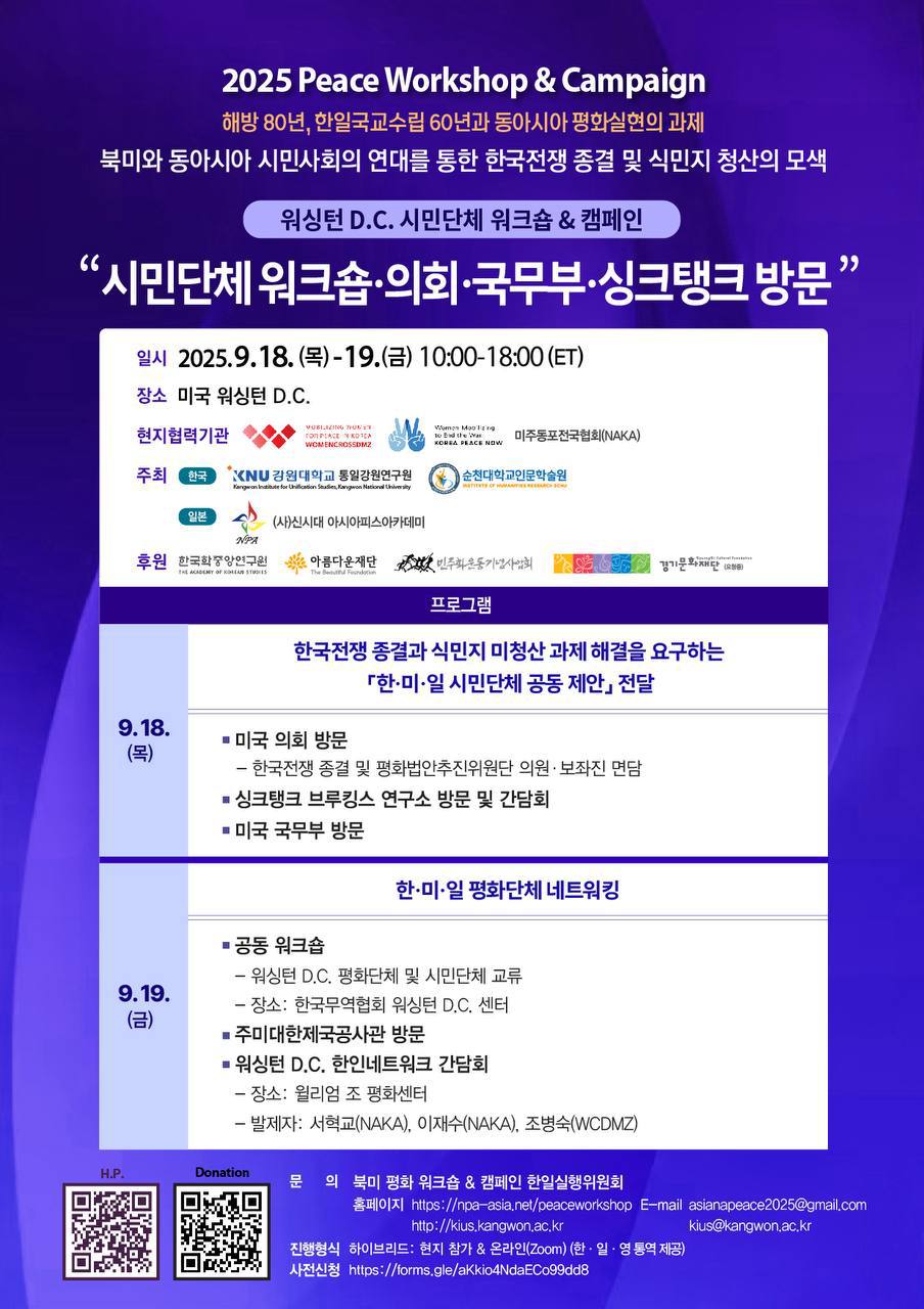 새로운 평화 구축을 위한 글로벌 시민연대의 초석을 마련하고자 동아시아-북미 평화워크숍을 전개합니다.