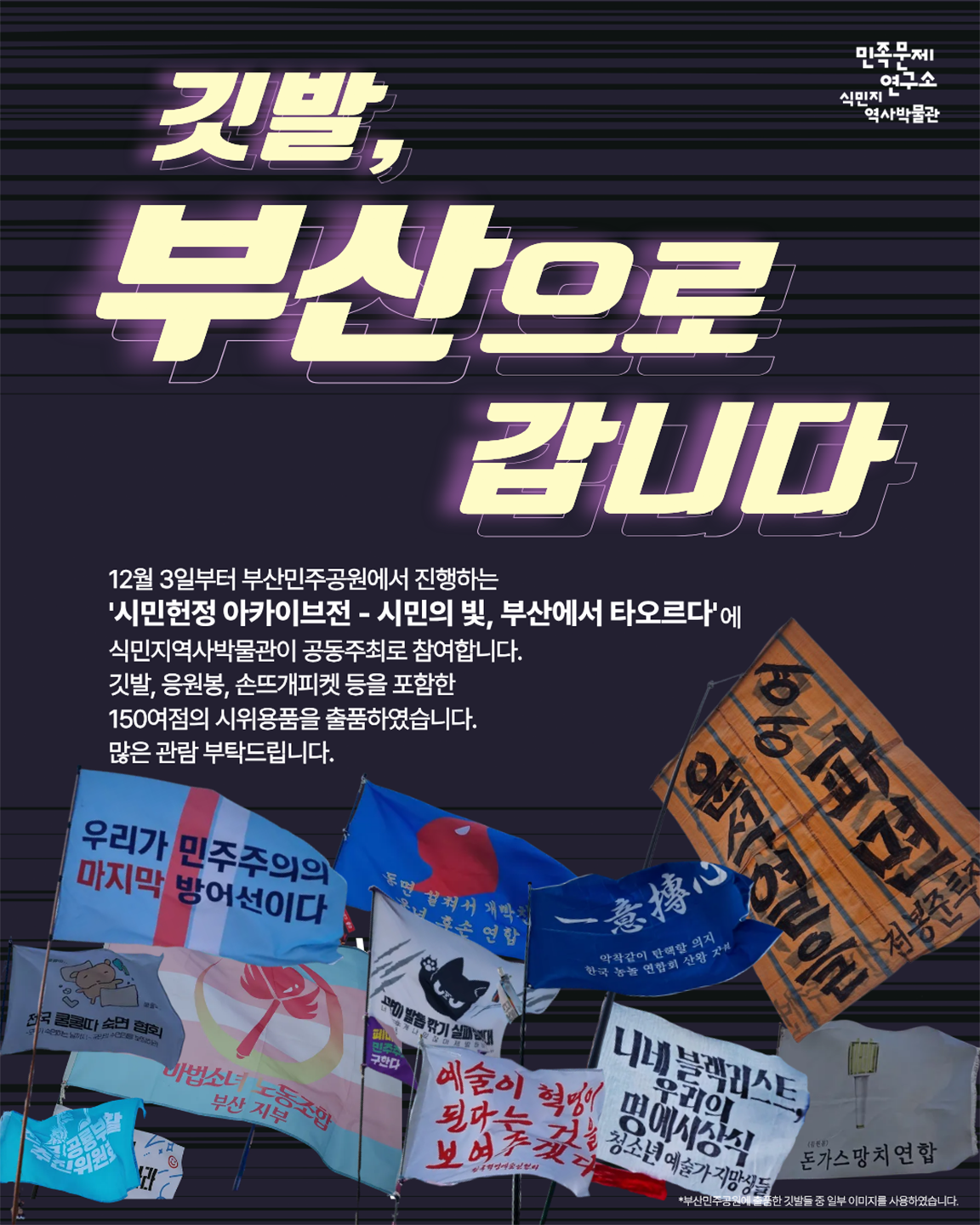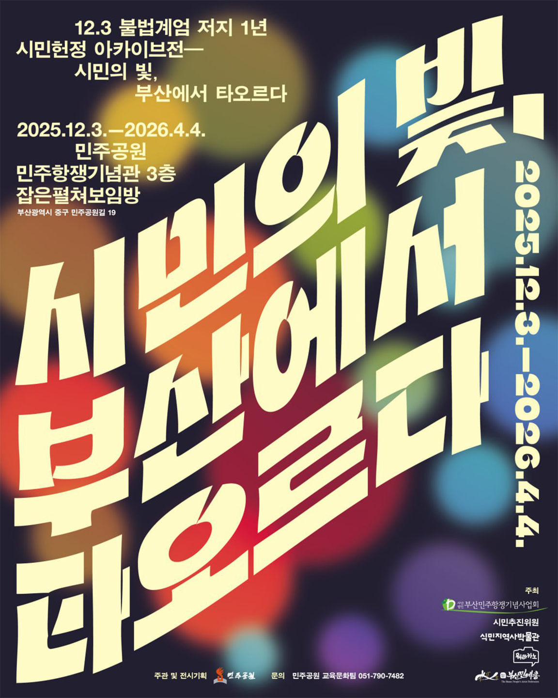 12월 3일. 내란으로부터 민주주의를 지켜낸 지 1년을 맞이하여 진행되는 '시민헌정 아카이브전 - 시민의 빛, 부산에서 타오르다’는 부산민주공원이 주관하고, 식민지역사박물관이 공동주최로 참여하였습니다.