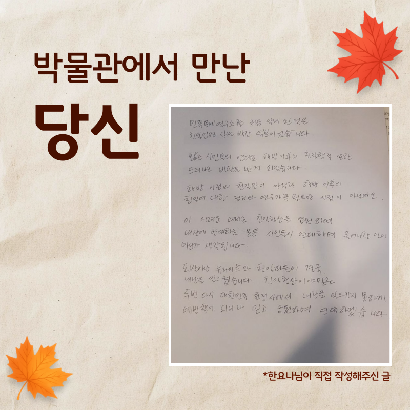 11월 박물관을 찾아온 수많은 관람객 중 제주에서 오신 한요나님이 남겨주신 메시지를 소개합니다.